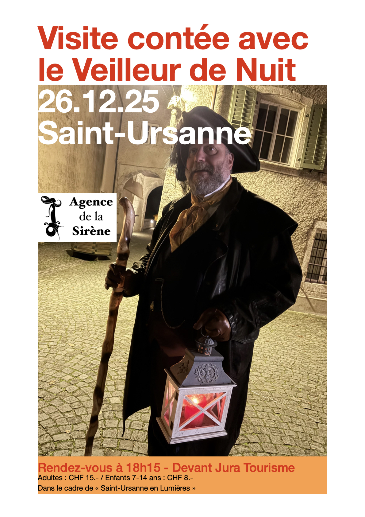 Découvrez les ruelles de la cité des bords du Doubs à la lanterne, avec le Veilleur de Nuit. Il vous contera au passage les plus fameuses légendes jurassiennes, peuplées de créatures et de personnages incroyables, ainsi que des anecdotes sur la ville. Une heure et demie à mi-chemin entre histoire et contes, pour tout public.